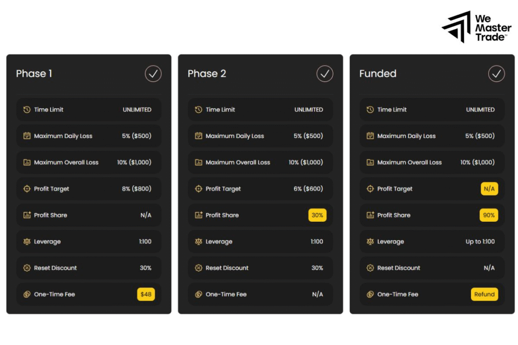 WeMasterTrade offers instant funding with very low fees, making it perfect for traders who want to start trading real capital quickly